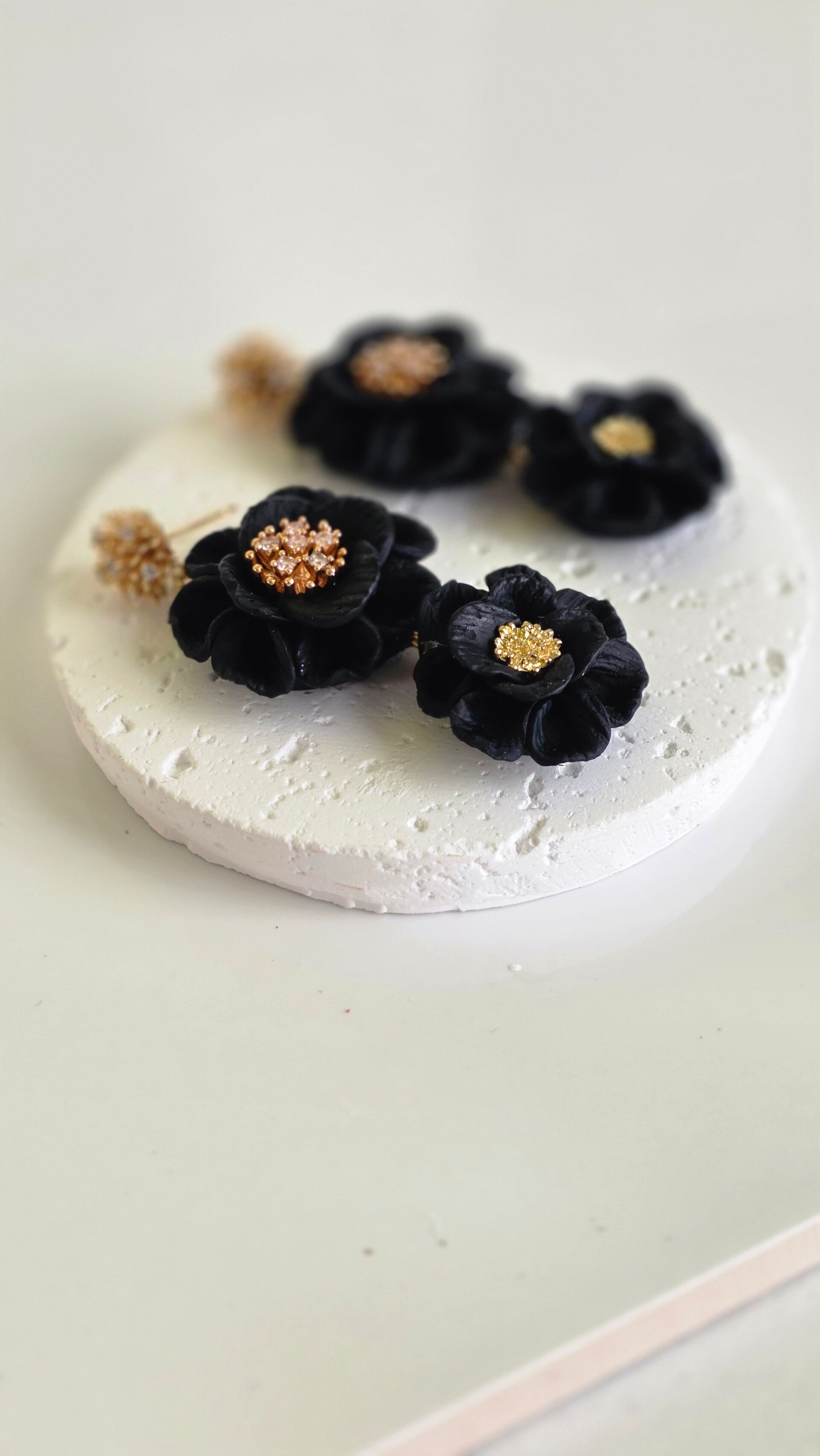 Elegante handgemaakte oorbellen in diep zwart polymeerklei, afgewerkt met een goudkleurig middenstuk vol fijne details. De bloemen zijn licht van gewicht maar ogen luxueus — perfect voor feestelijke gelegenheden of een stijlvolle everyday look.