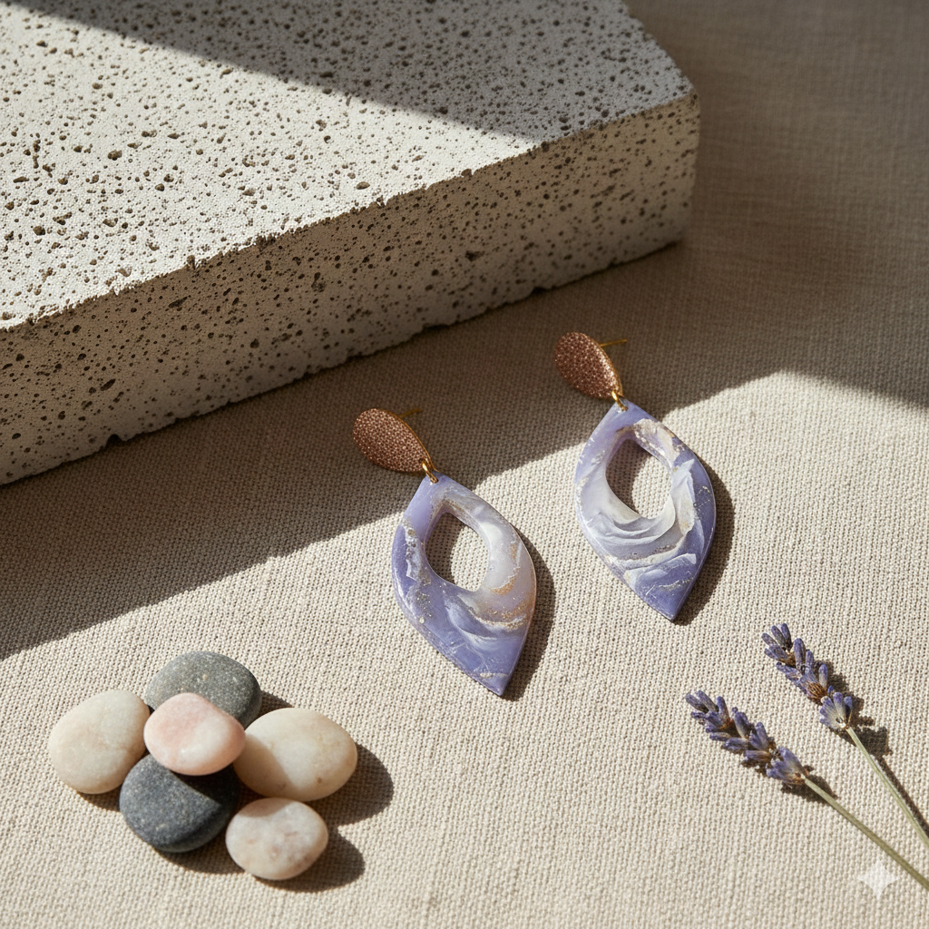 Deze elegante oorbellen hebben een zachte blauw-paarse marmertekening met fijne gouden accenten. De langgerekte bladvorm met open center geeft een verfijnde, vrouwelijke look die direct opvalt.