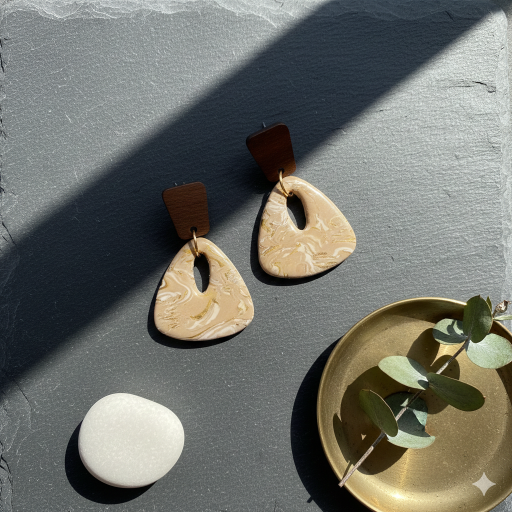 Deze elegante oorbellen combineren een warme beige marmermix met subtiele gouden accenten voor een zachte, natuurlijke uitstraling. De moderne driehoekige vorm met open center zorgt voor een stijlvolle en speelse look.
