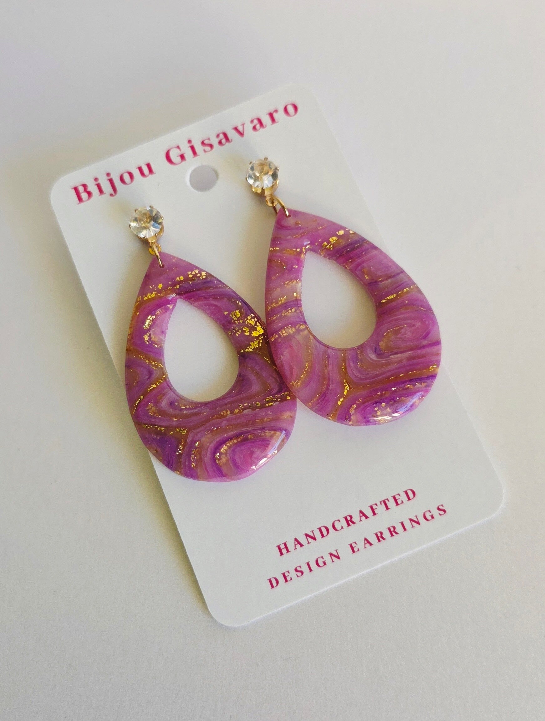 Deze elegante statement oorbellen zijn met de hand gemaakt uit polymeerklei en afgewerkt in een verfijnde roze-paarse marmerlook met goudaccenten. De subtiele goudspikkels zorgen voor een luxueuze uitstraling en maken elk paar uniek.