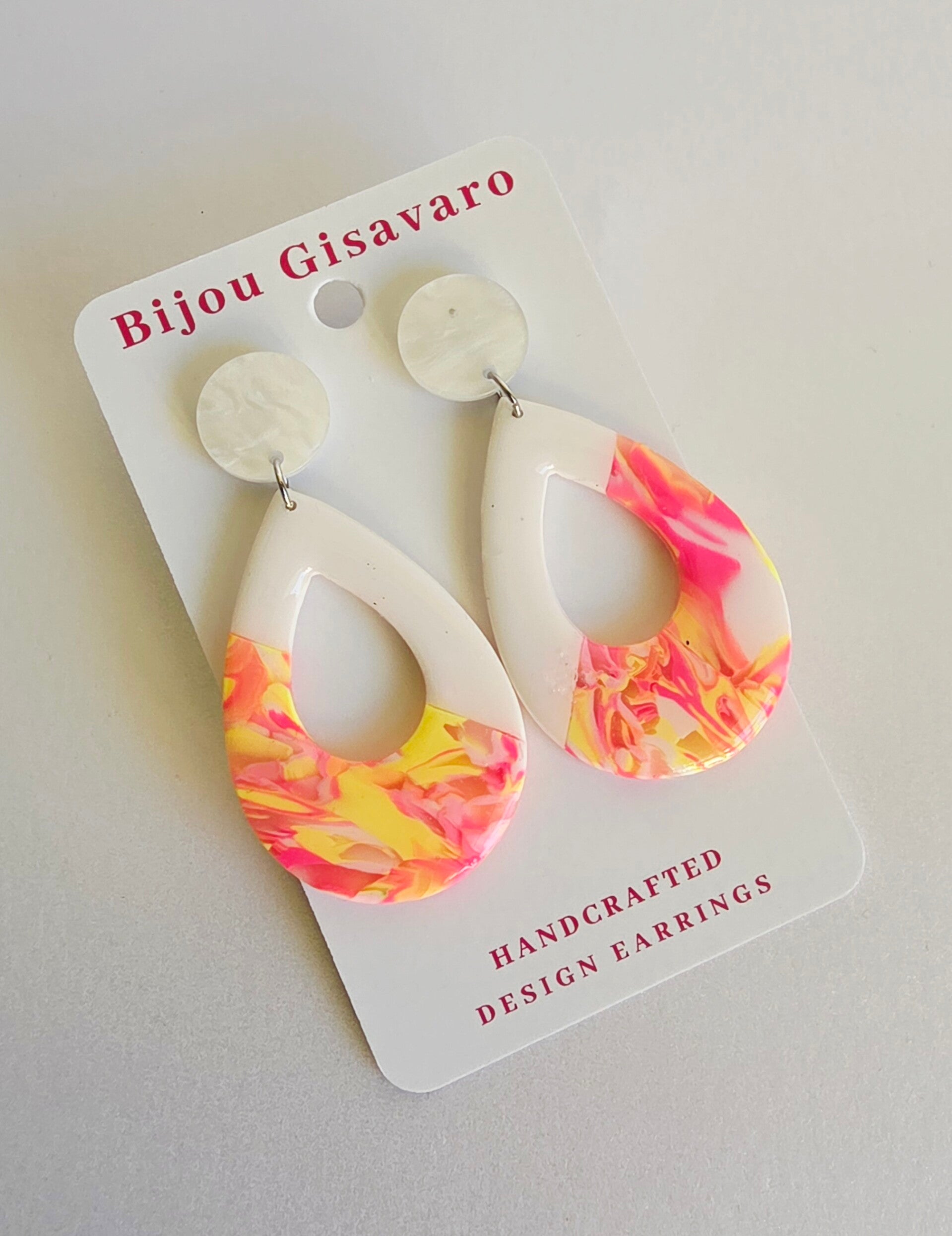 Deze elegante statement oorbellen zijn met de hand gemaakt uit polymeerklei en combineren een zachte witte bovenkant met een levendig roze-geel marmerpatroon. Het frisse kleurenspel geeft een zomerse, vrouwelijke uitstraling en maakt elk paar uniek.