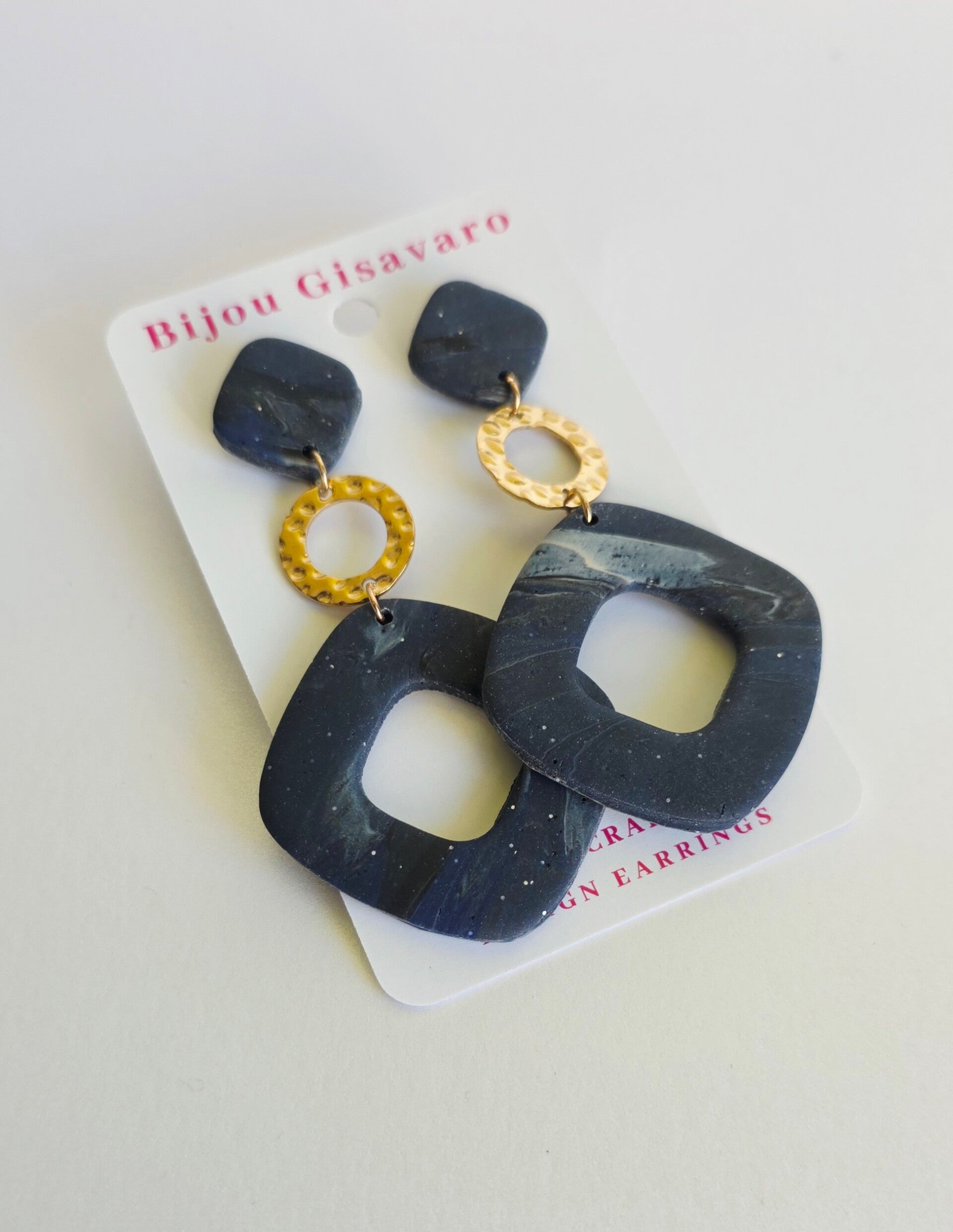 Deze stijlvolle statement oorbellen zijn met de hand gemaakt uit polymeerklei en combineren een diepe donkerblauwe/zwart gemarmerde tint met elegante goudkleurige accenten. De geometrische vormen geven het ontwerp een moderne, krachtige uitstraling.