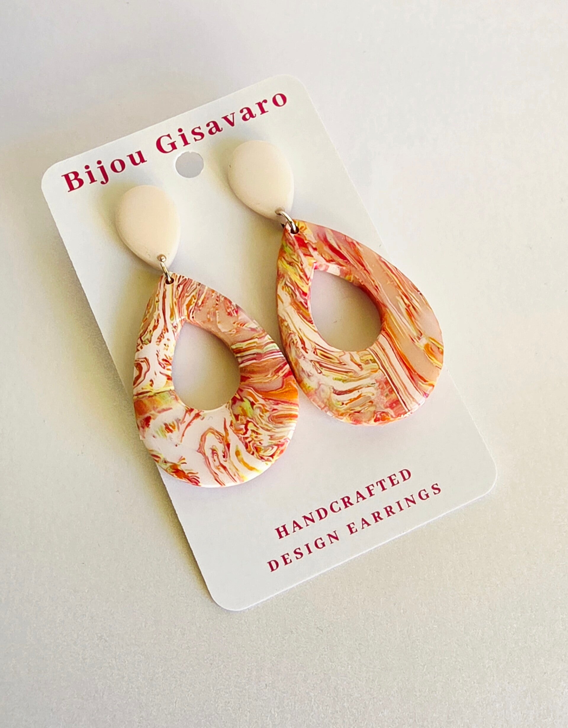 Deze elegante statement oorbellen zijn met de hand gemaakt uit polymeerklei en afgewerkt in zachte crèmetinten met een warm marmerpatroon in oranje en goudachtige accenten. Het vloeiende kleurenspel maakt elk paar uniek en geeft een verfijnde, vrouwelijke uitstraling.