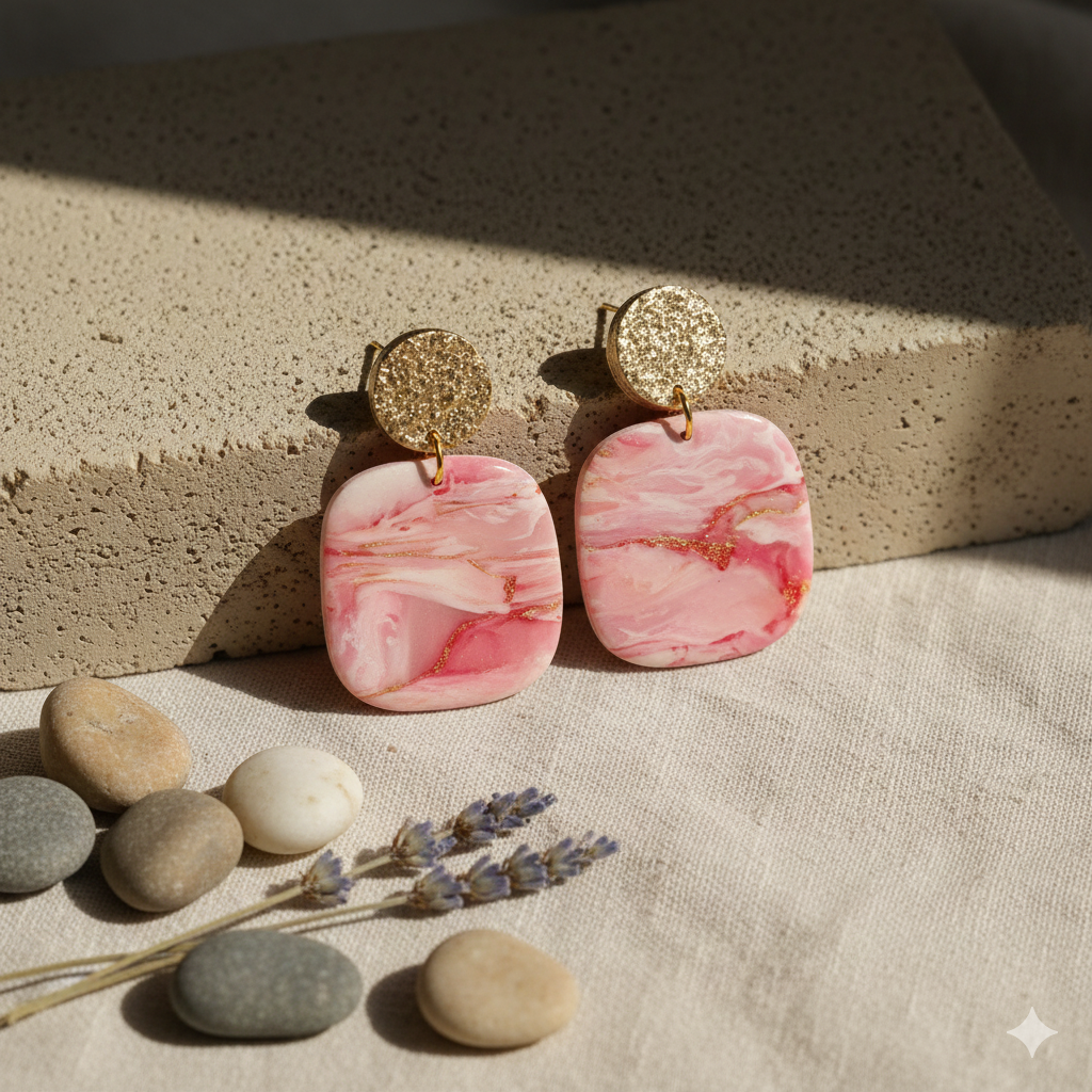 Deze stijlvolle statement oorbellen zijn handgemaakt uit polymeerklei en afgewerkt met gouden, getextureerde oorstekers. Het zachte roze marmerpatroon met subtiele diepte geeft een elegante en vrouwelijke uitstraling.