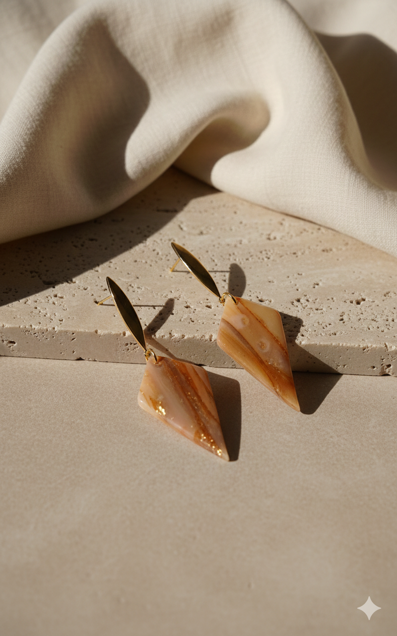 Deze verfijnde statement oorbellen combineren een elegante geometrische vorm met warme nude- en karameltinten, subtiel afgewerkt met een marmer- en goudaccent.