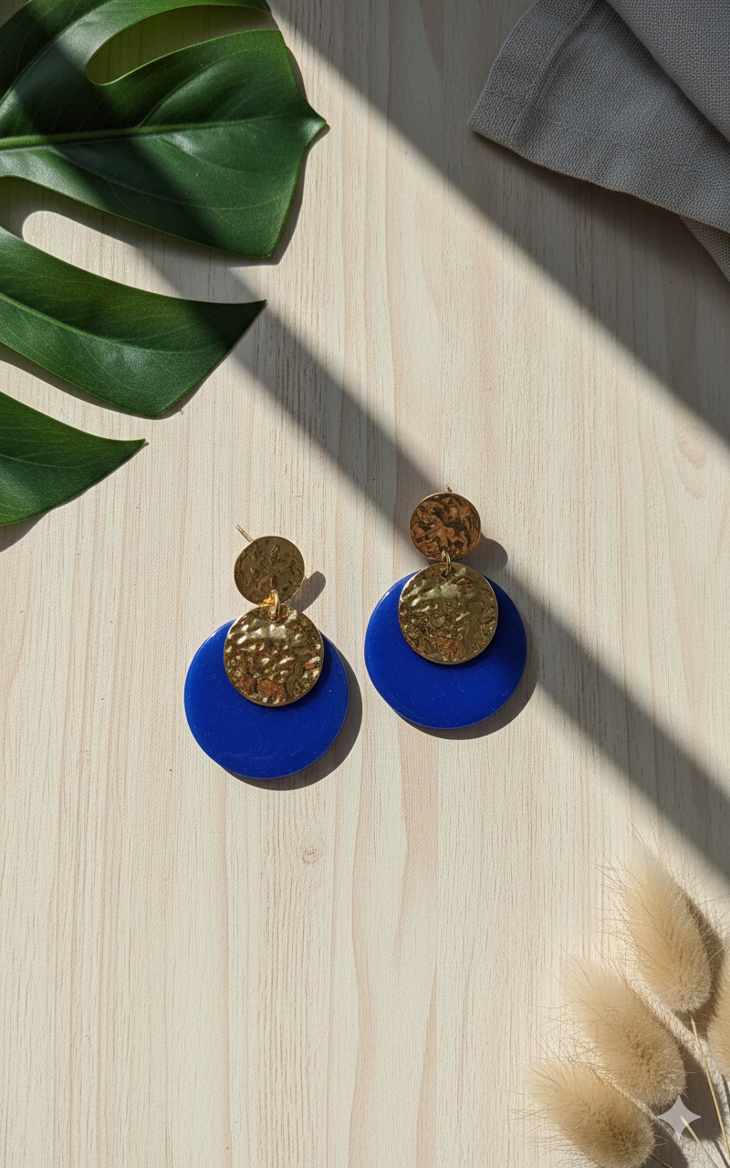 Oorbellen Nova zijn stijlvolle handgemaakte oorbellen met een krachtige en moderne uitstraling. De diepe koningsblauwe schijf in combinatie met de goudkleurige, licht gehamerde details zorgt voor een elegant contrast dat meteen in het oog springt. Een perfecte mix van kleur en luxe.