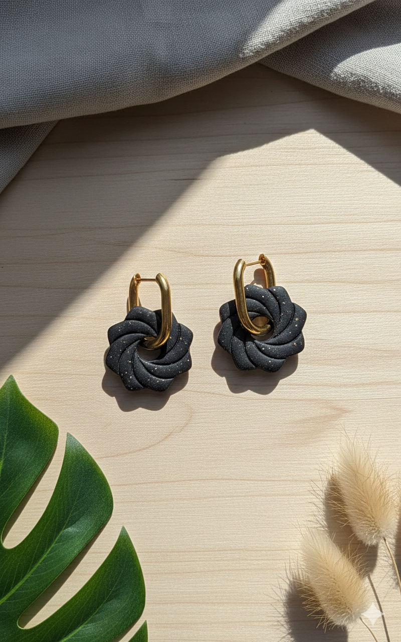 Oorbellen Elara zijn elegante, handgemaakte oorbellen met een verfijnde en moderne uitstraling. De diep matzwarte, gevlochten vorm met subtiele glinstering wordt prachtig gecombineerd met goudkleurige oorringen. Tijdloos, stijlvol en perfect voor elke gelegenheid — van casual tot chic.