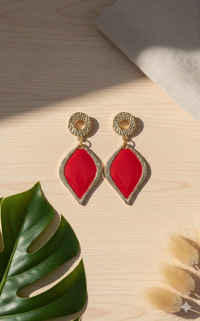 Oorbellen Elara zijn elegante oorbellen met een diepe rode glans, omlijst door een verfijnde goudkleurige rand. Het geometrische bladvormige design geeft deze oorbellen een luxueuze en vrouwelijke uitstraling — perfect om elke outfit kracht en elegantie te geven.