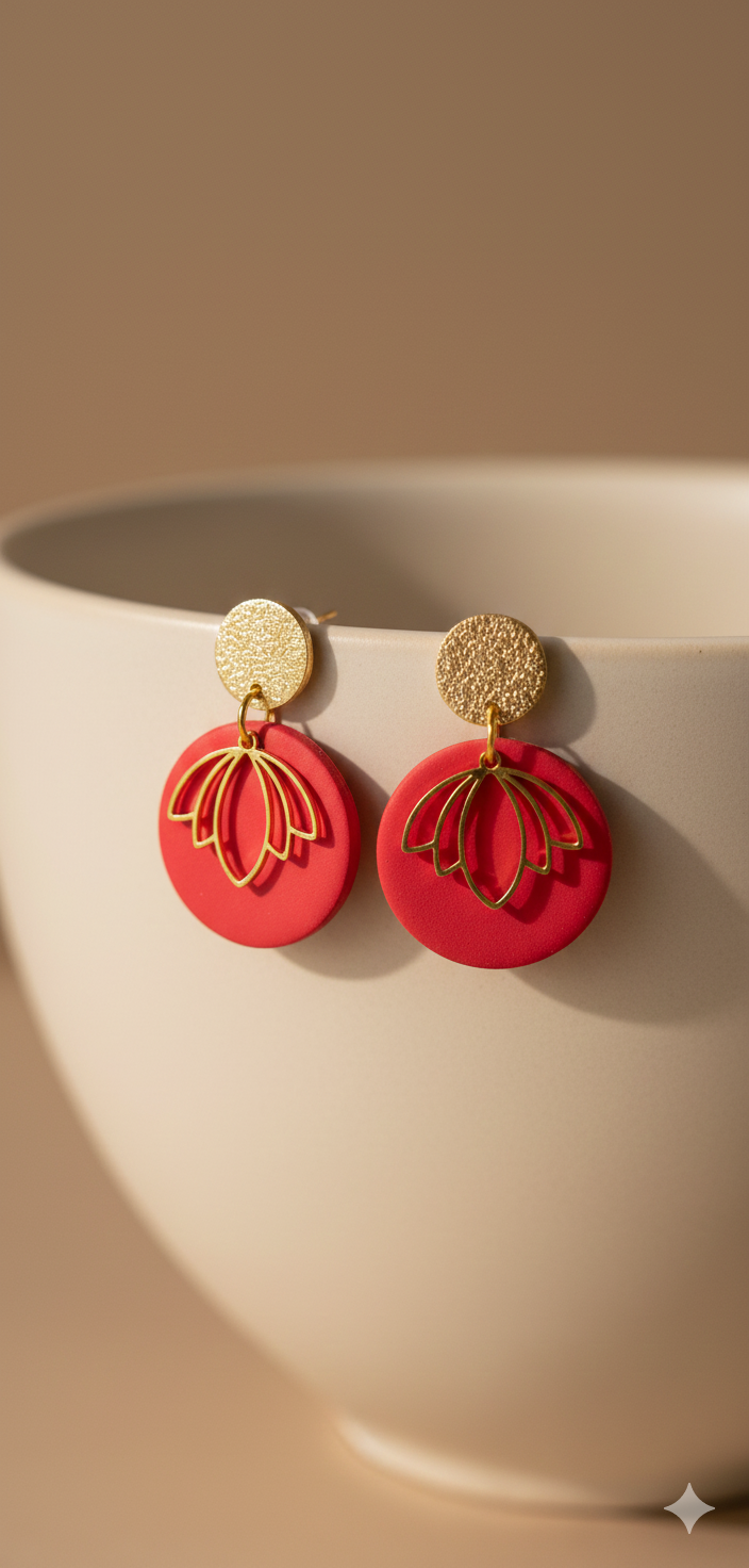 Oorbellen Noali zijn elegante statement oorbellen met een warme rode tint en een verfijnd goudkleurig bloemdetail. De combinatie van de matte rode cirkel en het fijne goudaccent zorgt voor een vrouwelijke, stijlvolle uitstraling met een speelse touch.