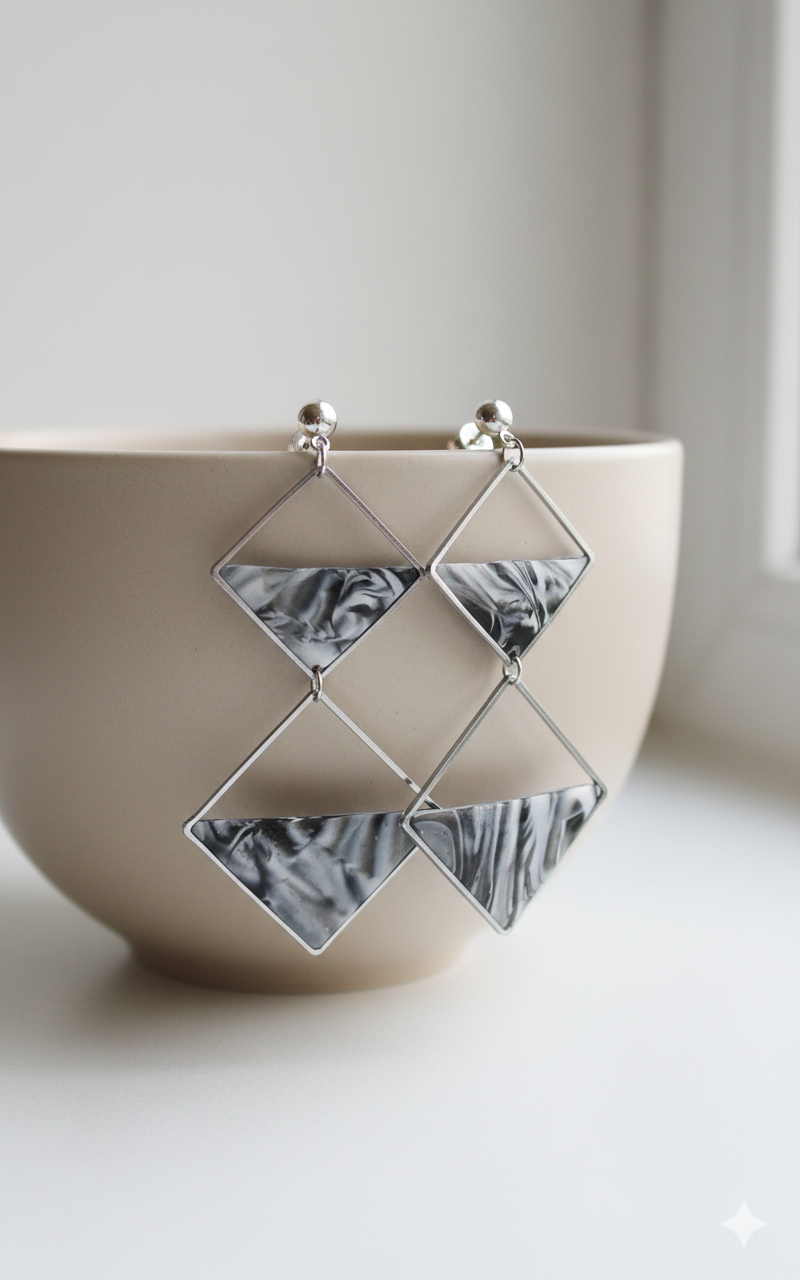 Luchtige geometrische oorbellen met een zilverkleurig frame en marmerlook detail. Tijdloos en stijlvol.