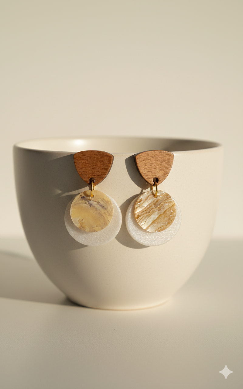 Natuurlijke oorbellen met een combinatie van houtlook en zachte beigetinten. Warm, licht en perfect voor een boho of minimalistische stijl.