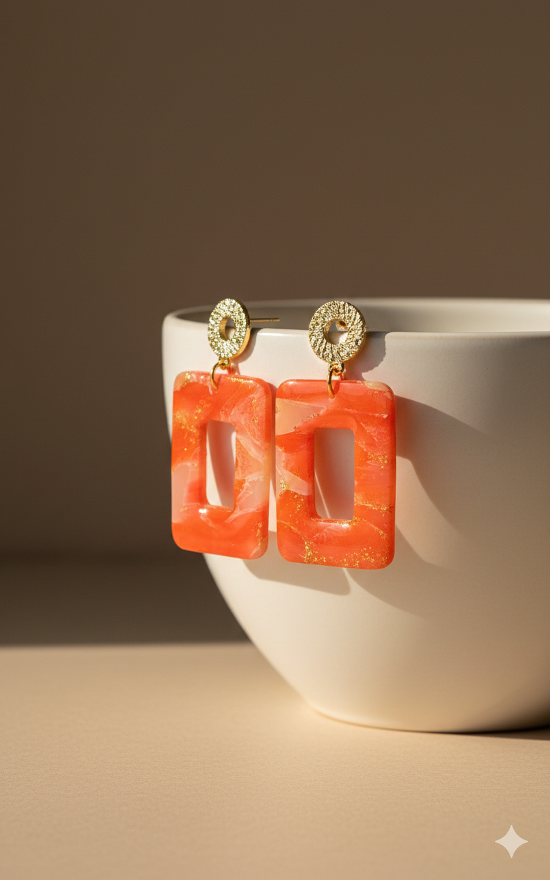 Levendige oranje oorbellen met gouden accenten en een moderne rechthoekige vorm. Ideaal voor wie graag kleur draagt.