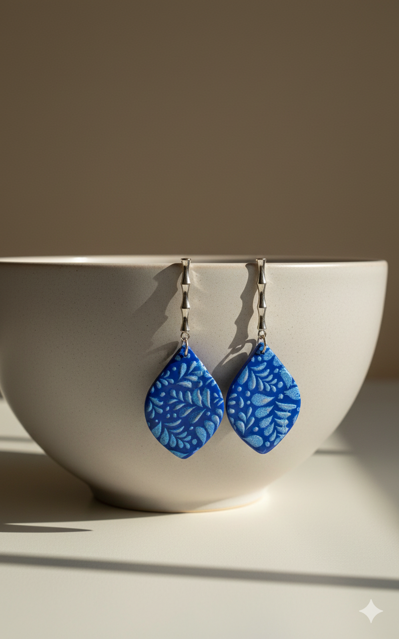 Kleine druppelvormige oorbellen met een verfijnd bloemmotief in blauw. Subtiel, elegant en ideaal voor dagelijks gebruik.