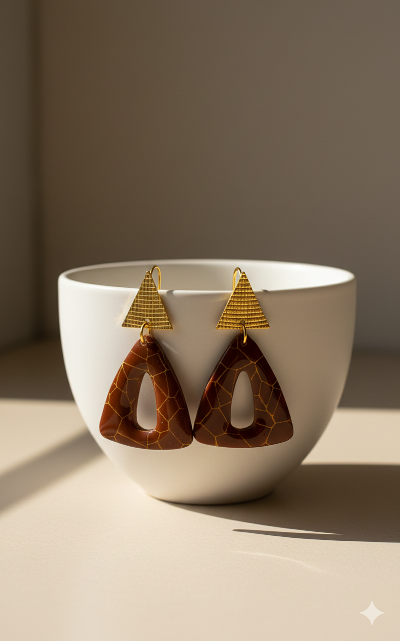 Warme bruintinten met fijne goudaccenten in een geometrische vorm. Ideaal voor herfst- en winteroutfits.
