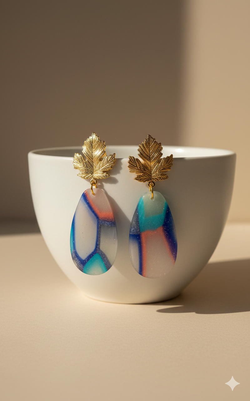Elegante handgemaakte oorbellen uit polymeerklei met een zachte mix van blauw, turquoise en nude tinten. Afgewerkt met een verfijnde gouden bladstud voor een natuurlijke, chique uitstraling. Lichtgewicht en comfortabel om te dragen.