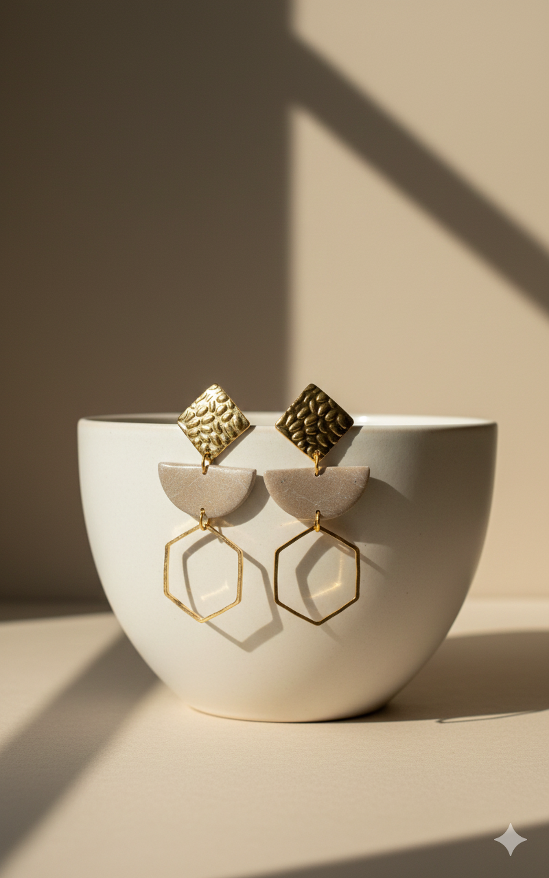 Neutrale beige tinten gecombineerd met goud en geometrische details. Elegant en modern.
