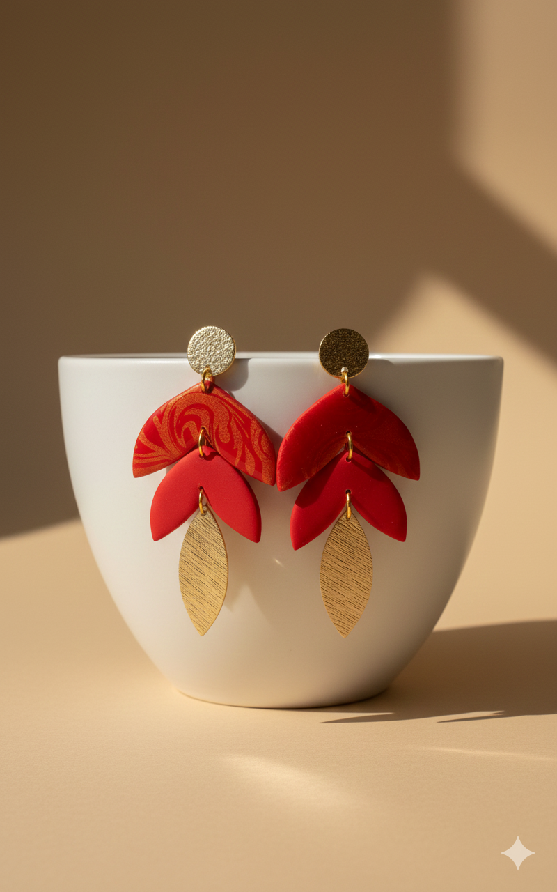 Handgemaakte statement oorbellen uit polymeerklei met warme rode tinten en goudkleurige details. Elegant en lichtgewicht.
