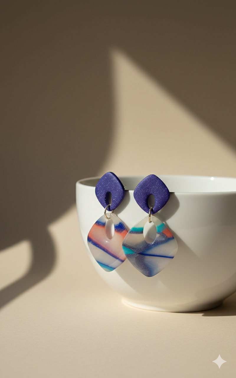 Deze oorbellen zijn handgemaakt uit polymeerklei en combineren een diepe blauwe bovenkant met een speelse blauw-wit-zachte tinten marmerlook onderaan. De open geometrische vorm geeft een moderne en frisse uitstraling. Lichtgewicht en aangenaam om te dragen.