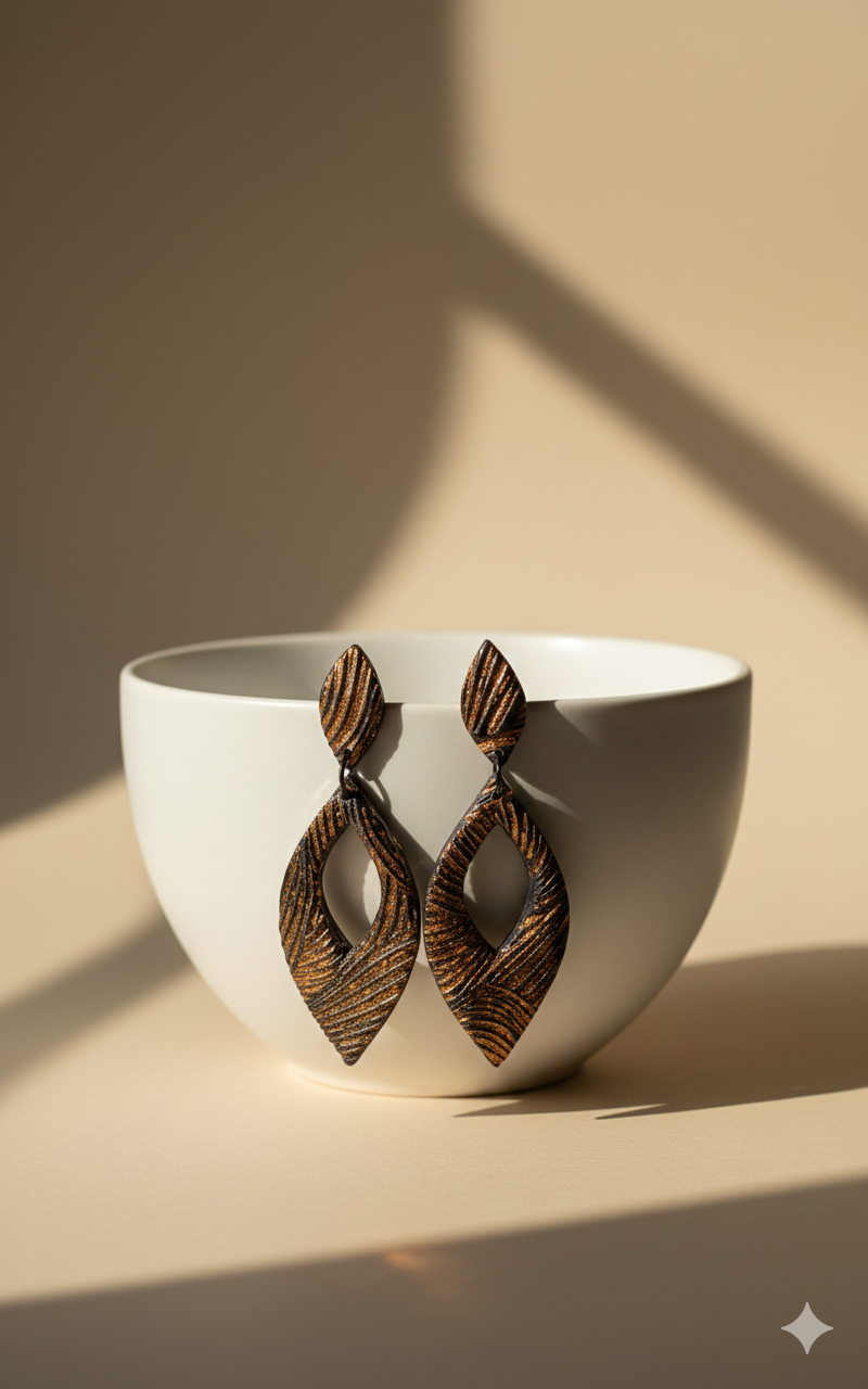 Deze oorbellen zijn handgemaakt uit polymeerklei en hebben een warme bruin-gouden marmerstructuur met een elegante open druppelvorm. Het verfijnde patroon geeft een luxueuze uitstraling, terwijl ze lichtgewicht en comfortabel blijven voor dagelijks dragen of een avondlook.