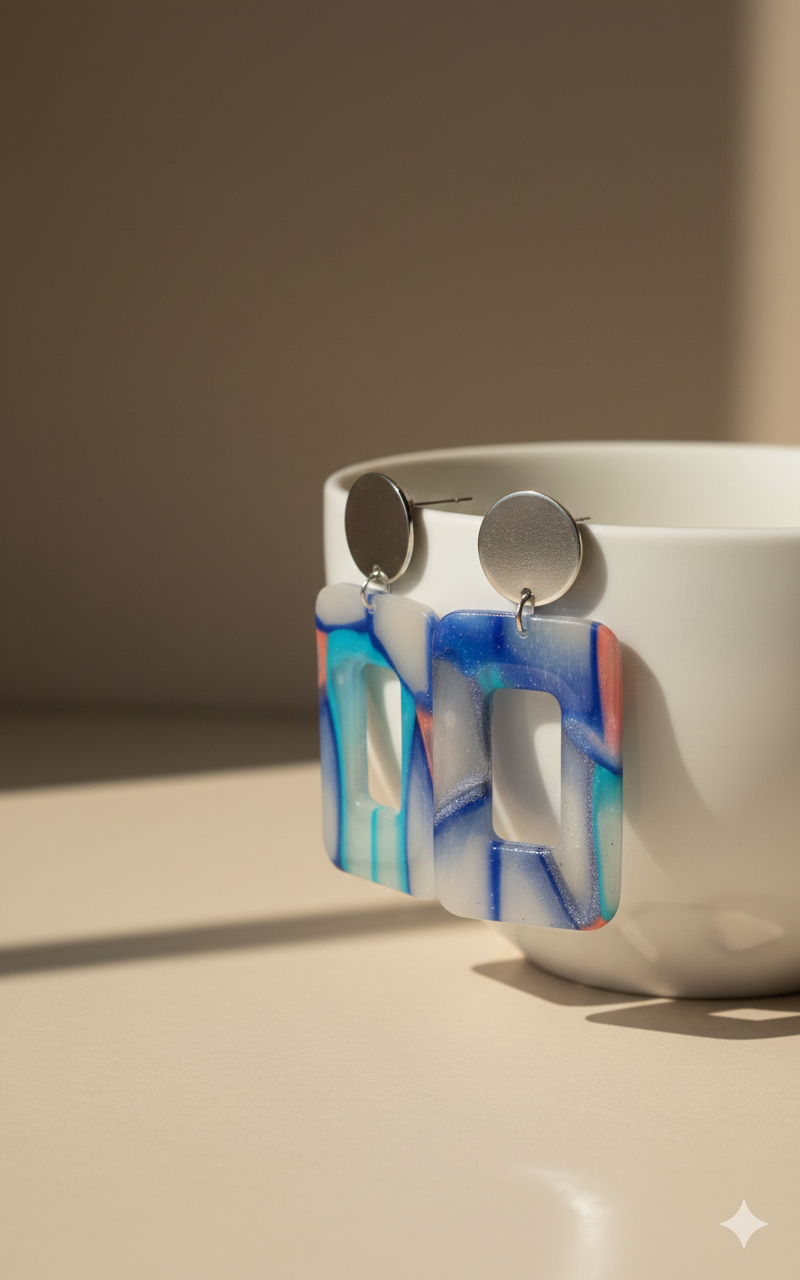 Deze oorbellen zijn handgemaakt uit polymeerklei en hebben een frisse blauw-wit marmerlook met subtiele kleuraccenten. De open rechthoekige vorm geeft een moderne uitstraling. Ze zijn lichtgewicht en comfortabel om de hele dag te dragen.