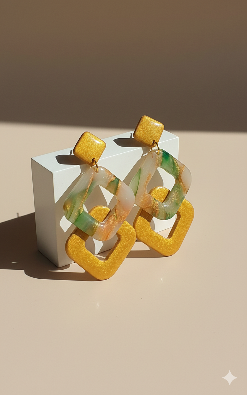 Oorbellen Elina zijn handgemaakt uit polymeerklei en vallen op door hun grafische vierkante vormen en warme goudtinten, gecombineerd met een zachte groen-crème marmerlook. De speelse schakeling van vormen geeft deze oorbellen een moderne en stijlvolle uitstraling. Elk paar is uniek dankzij het handgemaakte patroon. Ondanks hun statement-look zijn ze lichtgewicht en comfortabel om de hele dag te dragen.