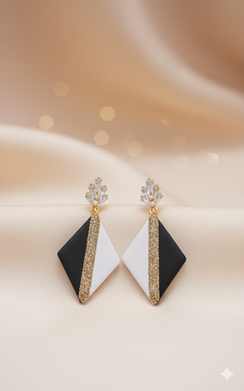 Deze elegante oorbellen zijn met de hand gemaakt uit polymeerklei en afgewerkt in een stijlvolle combinatie van zwart, wit en subtiel goudglitter. Het geometrische ontwerp zorgt voor een moderne en chique uitstraling, perfect voor zowel dagelijks gebruik als speciale gelegenheden.