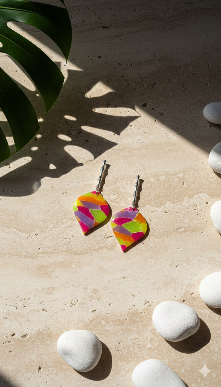 Speelse handgemaakte oorbellen met een levendig kleurenpatroon in fuchsia, oranje, geel, groen en paars.