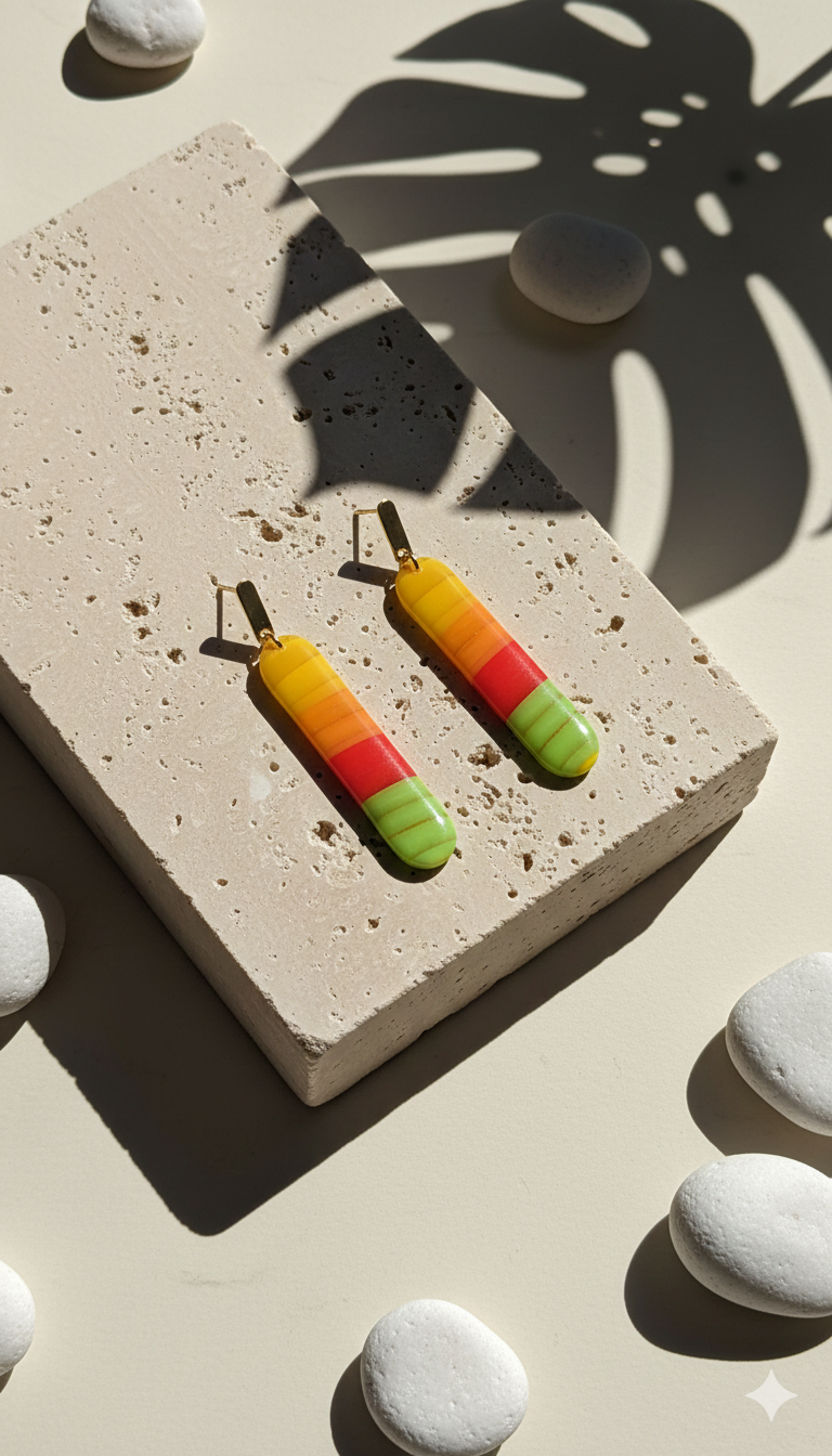 Handgemaakte oorbellen met speelse kleurvlakken in geel, oranje, rood en zachtgroen.