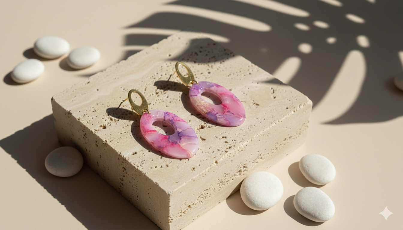 Handgemaakte oorbellen met een open ovale vorm en een subtiel marmerpatroon in roze en lila tinten.