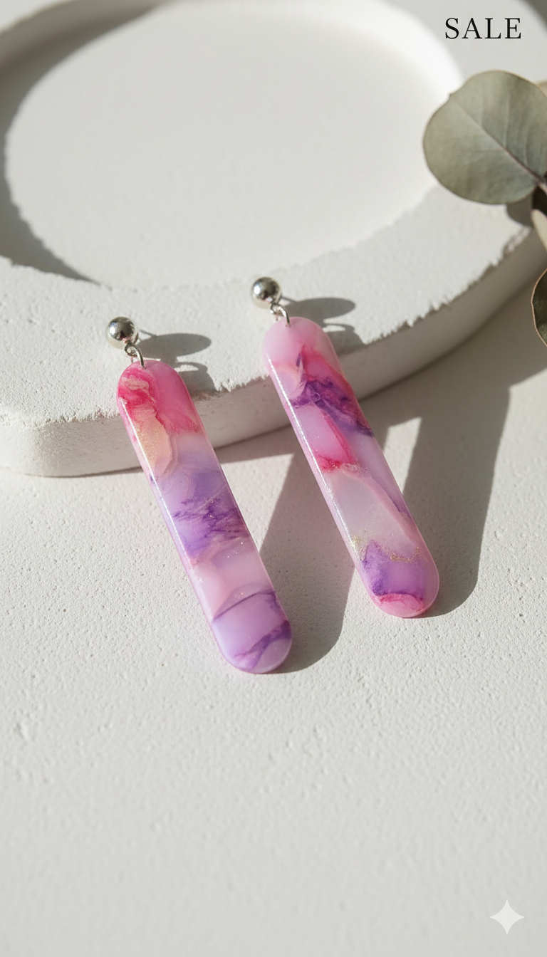Handgemaakte oorbellen met een compacte, afgeronde rechthoekvorm en een subtiel marmerpatroon in roze, lila en zachte groentinten.