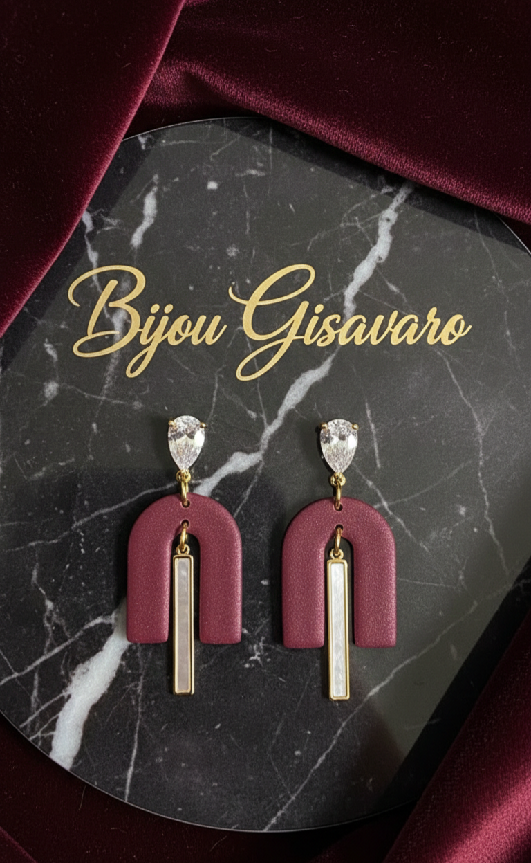 Elegante handgemaakte oorbellen in diepe bordeaux tint met verfijnde gouden details en een sprankelende crystal top. De moderne boogvorm gecombineerd met de verticale goudaccenten zorgt voor een stijlvolle en luxueuze uitstraling. Lichtgewicht en comfortabel om te dragen – perfect voor feest, diner of een chique avondlook