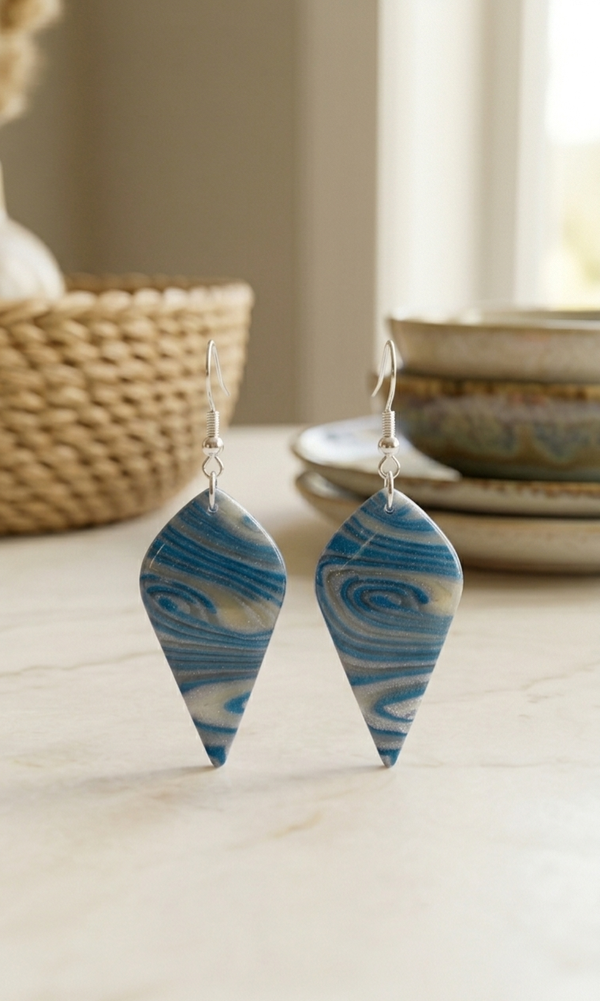Elegante statement oorbellen met een speels blauw marmer effect gecombineerd met een zachte basis. geeft een moderne en stijlvolle uitstraling.