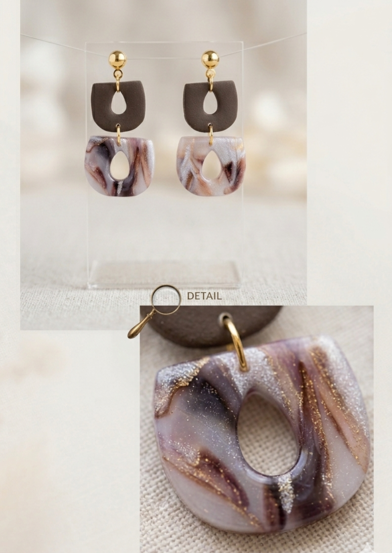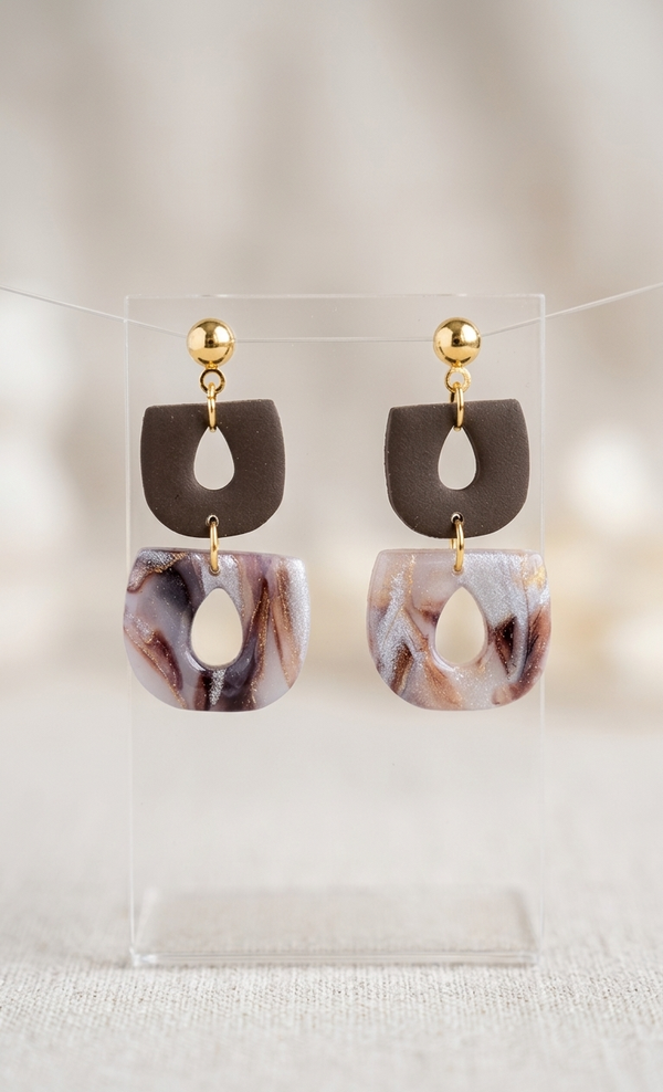 Ontdek de perfecte balans tussen modern design en natuurlijke texturen met deze handgemaakte geometrische oorbellen. Dit unieke paar combineert een strakke, matte bruine vorm met een dromerige marmeren hanger, afgewerkt met luxe goudkleurige details.